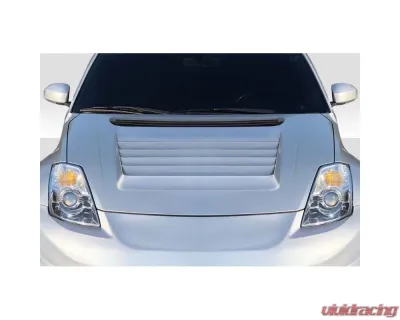 Elevate your Nissan 350Z's performance and aesthetic appeal with the 2003-2008 Nissan 350Z Z33 Duraflex D1 Hood - 1 Piece (117707). Crafted from a unique blend of fiberglass, plastic, and rubber, Duraflex hoods are designed to provide a lightweight yet durable solution for car enthusiasts looking to enhance their vehicle's style and functionality. The 117707 model features a sleek design that not only improves airflow to the engine but also reduces overall weight, allowing for better acceleration and handling.
