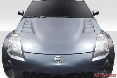 In conclusion, the Duraflex TS-3 Hood - 1 Piece (model 113357) is an excellent investment for any Nissan 350Z enthusiast looking to elevate both the performance and appearance of their vehicle. With its innovative design, quality materials, and precise fitment, this hood is sure to turn heads on the street and track alike. Don't miss the opportunity to upgrade your ride with Duraflex ' where style meets performance.