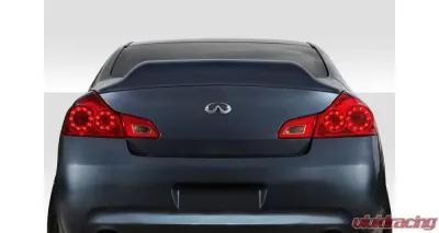 The 2007-2015 Infiniti G Sedan G25 G35 G37 / Q40 Duraflex Drift Rear Wing Spoiler - 1 piece is engineered for performance and style. Made from high-quality fiberglass, this spoiler is lightweight yet durable, ensuring it can withstand both the rigors of high-speed driving and the elements. The aerodynamic shape of the 117600 reduces drag and increases downforce, giving you better handling and stability at higher speeds.
