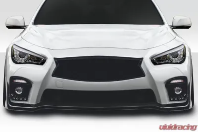 The 2014-2018 Infiniti Q50 Duraflex Bltz Front Bumper - 1 Piece (117096) is a stunning addition to any Q50, designed to elevate both aesthetics and aerodynamics. Crafted from a unique blend of fiberglass and plastic, Duraflex products are known for their durability and lightweight properties. This front bumper not only enhances the sporty look of your vehicle but also improves airflow, which can lead to better engine performance and cooling.