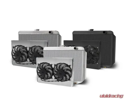 AFCO Aluminum Black Radiator & Shroud Passenger Inlet Dual Satin Shroud 22" Wide Downflow w/ Transcooler Mopar A, B & E Body