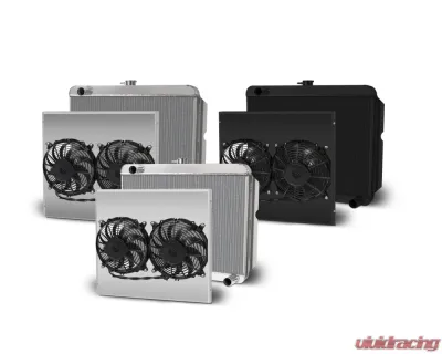 AFCO Down Flow Aluminum Black Radiator & Shroud Mopar Driver Inlet Dual Satin Shroud 22" Wide w/ Transcooler Mopar A, B & E Body