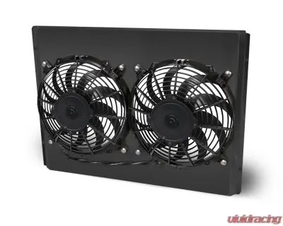 AFCO dual fans & black ceramic coated aluminum shroud assembly made to fit the 83295 series AFCO Mopar aluminum radiator. Mounting hardware is included. The fans pull 2310 total CFM.
