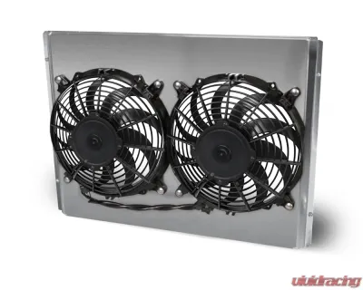 AFCO dual fans & brushed satin finish aluminum shroud assembly made to fit the 83295 series AFCO Mopar aluminum radiator. Mounting hardware is included. The fans pull 2310 total CFM.