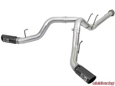 The dual side exit features 5" angle-cut rolled edge black stainless steel clamp-on tips, complete with a powder-coated laser-cut AFE Power logo. This not only adds a touch of style but also enhances the overall look of your truck.