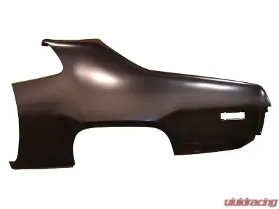 New reproduction quarter panel w/o inner reinforcements for the 1971 Plymouth B-Bodies. Each quarter panel is manufactured from high quality, heavy gauge steel on our exclusive new tooling and feature, depending on application, correct as original body lines, braces, marker light holes, and antenna cut-out. Unlike lesser quality competitors parts, AMD quarter panels look great and fit even better! Like all AMD parts, this quarter panel will arrive in a black EDT Coat finish and will require standard prep work prior to paint.