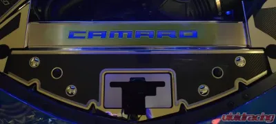 Give your 2016-2020 Chevrolet Camaro an eye-catching upgrade with the GM Officially Licensed Carbon Fiber with LED Illumination CAMARO Front Header Plate. This stylish accessory is crafted from premium brushed stainless steel, featuring polished trim on the CAMARO plate section, and comes with your choice of LED color for the CAMARO lettering. The real carbon fiber overlay on the upper portion adds a touch of sophistication to your engine bay.