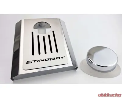 Upgrade your C7 Corvette's engine bay with the stunning Automatic Master Cylinder Cover with Top Plate. This polished stainless steel piece, designed in the iconic Stingray style, is an official licensed product that brings both style and durability to your vehicle.