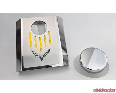 Upgrade the look of your C7 Corvette's engine bay with the stunning Polished Stainless Steel Automatic Master Cylinder Cover featuring a stylish top plate in the iconic Corvette flag design. This premium accessory not only enhances aesthetics but also showcases the quality craftsmanship that you can expect from a licensed GM product.