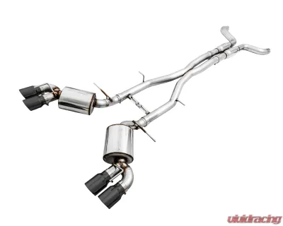 You’ve got options too—choose between resonated or non-resonated mid-pipes based on your sound preference. And let’s talk tips: the 4.5" double-walled tips come in chrome silver or diamond black, and they’re adjustable, so you can set them just right for that perfect depth into the bumper. Plus, each tip features the AWE logo, ensuring they look as good as they sound.