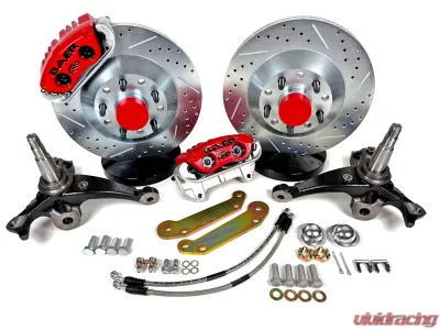 This brake kit includes modified stock height spindles, premium bearings with pre-installed races, dust caps, and all necessary mounting hardware for straightforward installation. Ensure you have a 15/16" master cylinder for optimal performance; a 7/8" master cylinder can be used for manual setups. Larger master cylinders may result in excessive pedal effort without adequate line pressure.