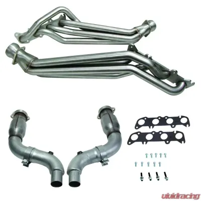 These BBK Performance full length exhaust headers and matching high flow catted mid pipe kits offer unsurpassed value, performance, quality, and fitment. Dyno tested and built right here in the USA, our products outperform the competition hands down. Every long tube exhaust header system is built with CNC mandrel bent tubing for unrestrictive exhaust flow and maximum performance. All headers include 3/8" laser cut exhaust flanges, patented scavenging collector design, and gasket less ball and socket connectors to easily connect the matching mid pipes. These performance exhaust kits have been designed specifically for your vehicle's application to get the most horsepower and torque to the ground for maximum performance across the RPM range. All matching mid pipes included in our kits have high flow catalytic converters installed for optimum sound and performance gains. All of these BBK kits are designed to replace the factory shorty style headers and factory mid pipe. Each BBK long tube header and matching mid pipe kit will bolt directly up to your cat back exhaust on your vehicle to complete the system to the tail pipe. Our decades of exhaust design and experience make BBK Performance the number one choice for your late model American car or truck.