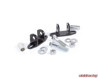 This solution provides a heavy duty cross pin and mount blocks to convert the shock mounting to a standard EB1 eyelet. The design prevents the transfer of noise and vibration caused by bushing movement. Shock absorber bushings are preloaded for better performance and longevity. Machined bushing surfaces reduce friction and wear. Retains the original mounting alignment to prevent stress on shock absorber and bushing. Provides almost 1/2 in. of additional down travel at shock absorber. Manufactured from premium grade steel and Zinc-coated for corrosion resistance. Compatible with OE and aftermarket shock absorbers.
