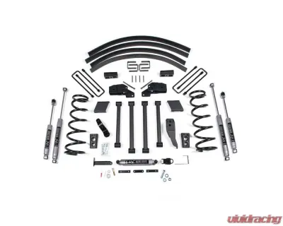 Up front the lift kit includes Pro-Ride coil springs, all four control arms plus relocation bracket, forged drop pitman arm and track bar bracket for steering correction, bump stops, sway bar drop brackets, and precision tuned NX2 or FOX 2.0 nitrogen charged shocks. In the rear this kit utilizes heavy duty cast steel block and add-a-leaf combo, longer u-bolts, and a matching set of NX2 Nitro or FOX 2.0 Performance shocks.