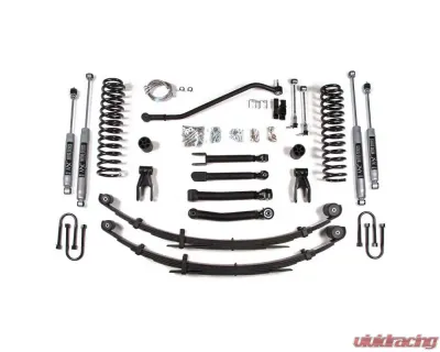 The lift kit includes front BDS Pro-Ride Coil Springs, a heavy duty adjustable front track bar that is utilized to recenter the front axle, bump stop extensions, stainless braided brake lines, sway bar quick disconnects to unlock the front suspension's potential to flex while maintaining quiet on road operation, and heavy duty front upper and lower adjustable control arms. The rear kit utilizes Glide-Ride leaf springs for maximum travel, stainless braided brake line, and extended shackles that let the spring flex. Finish of the kit with your choice of specially tuned NX2 nitro series gas shocks or FOX 2.0 IFP performance series gas shocks to offer improved damper performance..