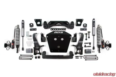 Unleash the full potential of your Toyota Tundra with the 5-inch Lift Kit, meticulously engineered to deliver uncompromising performance on and off the road. This kit combines BDS Upper Control Arms, Steering Knuckles, and Fox Performance Elite Coil Overs and Rear Shocks, setting a new standard for durability, handling, and style.BDS Upper Control Arms ensure optimal suspension geometry, enhancing wheel travel and articulation for seamless off-road navigation. Constructed from robust materials, they offer unmatched strength to tackle rugged terrain with confidence.Steering Knuckles are precision-engineered to maintain factory steering geometry, ensuring precise handling and reducing stress on components. This upgrade allows for increased ground clearance and accommodates larger tires, perfect for conquering any obstacle in your path.The inclusion of Fox Performance Elite Coil Overs and Rear Shocks elevates ride comfort and control to elite levels. Known for their advanced damping technology and race-proven reliability, these shocks deliver smooth performance across varying terrain, from rocky trails to highways.Visually striking and functionally superior, the 5-inch Lift Kit transforms your Tundra's appearance with a commanding stance and aggressive profile. It not only enhances off-road capability but also maintains on-road comfort, making it ideal for daily driving and weekend adventures alike.Whether you're a seasoned off-road enthusiast or exploring new trails, the Toyota Tundra 5-inch Lift Kit with BDS Upper Control Arms, Steering Knuckles, and Fox Performance Elite Coil Overs and Rear Shocks ensures unparalleled performance and durability. Elevate your driving experience today and embrace the limitless possibilities of exploration and adventure.BDS maximizes ground clearance with their heavy duty 1/4-inch thick laser cut perfect fit crossmembers. Paired with a front skid plate system that bolts together to create a rigid subframe while adding extra protection.BDS corrects steering geometry at the new taller ride height using a pair of high-strength, CNC machined ductile cast iron steering knuckle design to work with factory tie rod ends to maintain steering angles for proper function and ESC compatibility.