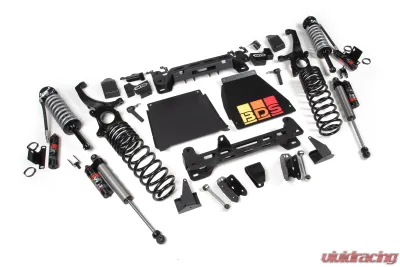 This kit takes advantage of BDS's proven high-clearance architecture for improved ground clearance, strength, and off-road protection, while correcting suspension and steering geometry for excellent on-road handling characteristics. Up front, the kit pairs the FOX 2.5 PE Coil-Overs with high-arched, 1/4-inch thick steel crossmembers, properly relocating the front differential to correct CV operating angles and protecting it with heavy-duty, laser-cut skid plates featuring the iconic tri-color stripe backing plate. Steering geometry is corrected at the new, taller ride height with CNC-machined ductile iron steering knuckles and high-strength tie rod ends, improving control and ESC system compatibility. These, along with the provided sway bar drops, bump stop extensions, brake line brackets, FOX reservoir mounts, and hardware packs, create a comprehensive front suspension lift ready for any challenge. In the rear, the kit utilizes a pair of ProRide coil springs, a track bar relocation bracket, extended sway bar links, and control arm brackets to lift and level the stance while maintaining suspension geometry and load capacity. For shocks, you have the option of FOX 2.0 IFP Performance Series gas shocks or an upgrade to the FOX 2.5 Performance Elite (PE) series piggyback reservoir shocks to match the front and further enhance vehicle performance and adjustability.