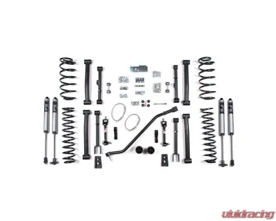 The lift kit includes front BDS Pro-Ride Coil Springs, a heavy duty adjustable front track bar that is utilized to recenter the front axle, bump stop extensions, stainless braided brake lines, sway bar quick disconnects to unlock the front suspension's potential to flex while maintaining quiet on road operation, and heavy duty front upper adjustable and fixed length lower control arms.