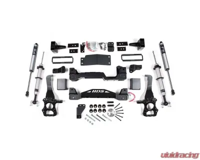 Prepare to get your 2015-2020 Ford F150 4WD truck dirty after installing a 6-inch lift kit with FOX 2.0 struts by BDS Suspension. Designed to improve stance the BDS 6 inch lift kit with FOX 2.0 front struts give more capability off-road. This kit includes everything necessary to set your F150 truck up right with clearance for up to 37" tires.This kit takes advantage of BDS's tried and true high-clearance design for improved ground clearance, strength, and offroad protection while correcting suspension and steering geometry for great on-road handling characteristics. Up front the kit utilizes FOX 2.0 strut shocks, high-arched 1/4-inch thick steel crossmembers, multipiece differential relocation brackets and skidplate designed for offroad protection. Steering geometry is corrected at the new taller ride height with a pair of massive CNC-machined ductile iron steering knuckles. These combined with the provided sway bar relocation brackets, brake line brackets, alignment cam bolts, supplied hardware and more provide a comprehensive front suspension lift ready for use and abuse.In the rear BDS utilizes high strength fabricated lift blocks and longer u-bolts to lift and level the stance along and NX2 Nitro or optional FOX 2.0 Performance Series shocks.These FOX 2.0 Performance Series coil-over struts bring impressive damper performance for great ride on and offroad capability designed as a direct bolt-in replacement for the factory strut assemblies while retaining the OE coil spring and top plate. They feature a 2.0" extruded and machined 6061 T6 aluminum body for better heat dispersion, along with an internal floating piston (IFP) to eliminate oil aeration, FOX's proprietary internals, 5/8" hard chrome plated heat-treated alloy shaft.BDS maximizes ground clearance with their heavy duty 1/4-inch thick laser cut perfect fit crossmembers. Paired with a front skid plate system that bolts together to create a rigid subframe while adding extra protection.BDS corrects steering geometry at the new taller ride height using a pair of high-strength, CNC machined ductile cast iron steering knuckle design to work with replacement tie rod ends to maintain steering angles for proper function and ESC compatibility.