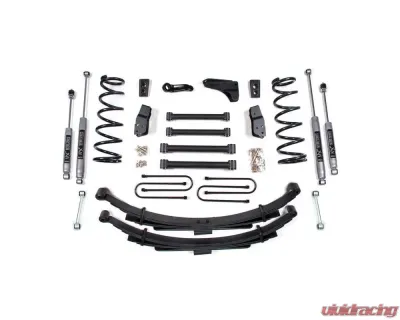 characteristics.Up front the lift kit includes diesel-specific Pro-Ride coil springs, all four control arms plus relocation bracket, forged drop pitman arm and track bar bracket for steering correction, bump stops, sway bar links, and precision tuned NX2 or FOX 2.0 nitrogen charged shocks. In the rear this kit utilizes heavy duty cast steel blocks, longer u-bolts, and a matching set of NX2 Nitro or FOX 2.0 Performance shocks.