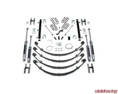 This 6-inch lift kit includes front and rear Glide-Ride leaf springs with new u-bolts, front and rear track bar relocation brackets to center the axle, stainless steel braided brake lines, sway bar disconnects, power steering pitman arm, bump stop extensions, a transfer case drop kit to ease the drive line angles and 1" extended shackles to let your springs really flex. Round out this kit with specially tuned NX2 nitro series gas shocks to offer improved damper performance.