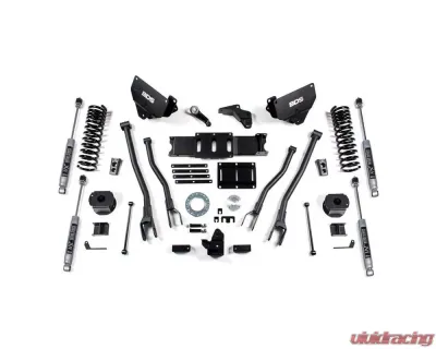 At this height, the transfer case needs to be indexed to allow use of the factory front driveshaft so an indexing ring and new transmission crossmember are supplied. In the rear this kit utilizes heavy duty air bag spacers, track bar relocation bracket to correct axle positioning, bump stop extensions, sway bar links and a matching set of NX2 Nitro or FOX 2.0 Performance shocks. BDS also supplies new air ride leveling sensor brackets to re-position the ride height sensors allowing it to perform just like it does at factory ride height and maintain full air bag range of motion.