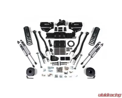 At this height, the transfer case needs to be indexed to allow use of the factory front driveshaft so an indexing ring and new transmission crossmember are supplied. In the rear this kit utilizes heavy duty air bag spacers, track bar relocation bracket to correct axle positioning, bump stop extensions, sway bar links and a matching set of NX2 Nitro or FOX 2.0 Performance shocks.