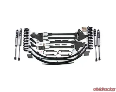 Raise the bar with a BDS Suspension 8-inch lift kit and 4-link conversion for your 2008-2010 Ford Super Duty F250 and F350 gas truck. Designed to improve stance, performance, and capability, this kit includes everything necessary to set your truck up right with clearance for up to 38" tires.Up front the lift kit includes gas-specific Pro-Ride coil springs, heavy-duty 4-link control arms, forged drop pitman arm and track bar bracket for steering correction, sway bar relocation, brake line brackets, and custom-tuned nitrogen charged shocks.In the rear this kit utilizes a replacement GlideRide leaf springs with integrated overload leaf, u-bolts, brake line brackets and a matching set of NX2 Nitro or FOX Performance shocks.A pair of full-length, gas-specific, Pro-Ride coil springs are supplied to provide the correct lift height and smooth, predictable ride across various terrains.Convert the factory stamped steel radius arms over to the BDS 4-link to optimize suspension geometry for better handling characteristics while adding strength and stability. This bolt-on upgrade utilizes high-strength 1/4-inch steel brackets that allow mounting of HD upper and lower control arms to correct axle positioning while limiting caster change throughout wheel travel.