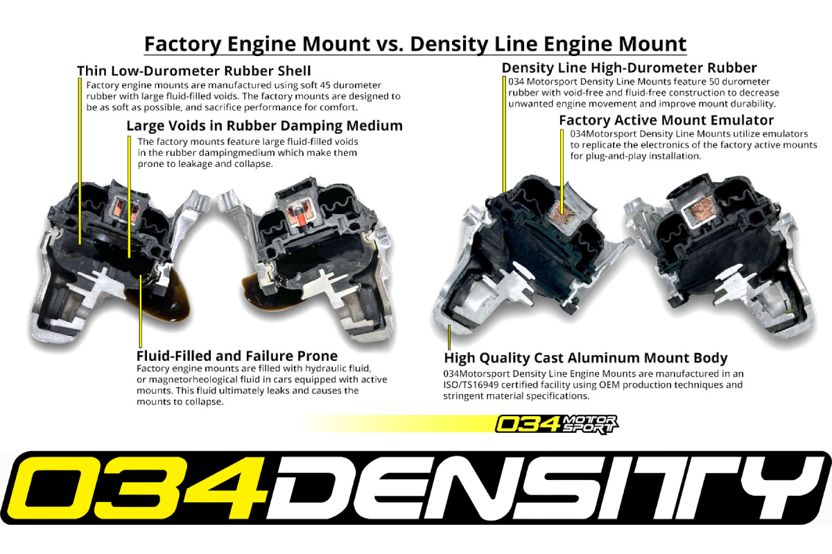 Street Density Motor Mounts are manufactured with 50 durometer rubber to limit unwanted noise and vibration transfer into the cabin. They are also void-free and fluid-free, eliminating the slop and excess movement associated with Audi’s factory mounts, resulting in improved shifting feel and driving dynamics while vastly improving long-term durability and longevity too. 034Motorsport’s Street Density Motor Mounts have become the new standard in comfort and performance. These mounts are redesigned with performance in mind, and crafted from high-durometer rubber for increased performance and durability, without sacrificing comfort. They also eliminate the possibility of leakage and collapse associated with the factory mounts on these vehicles.