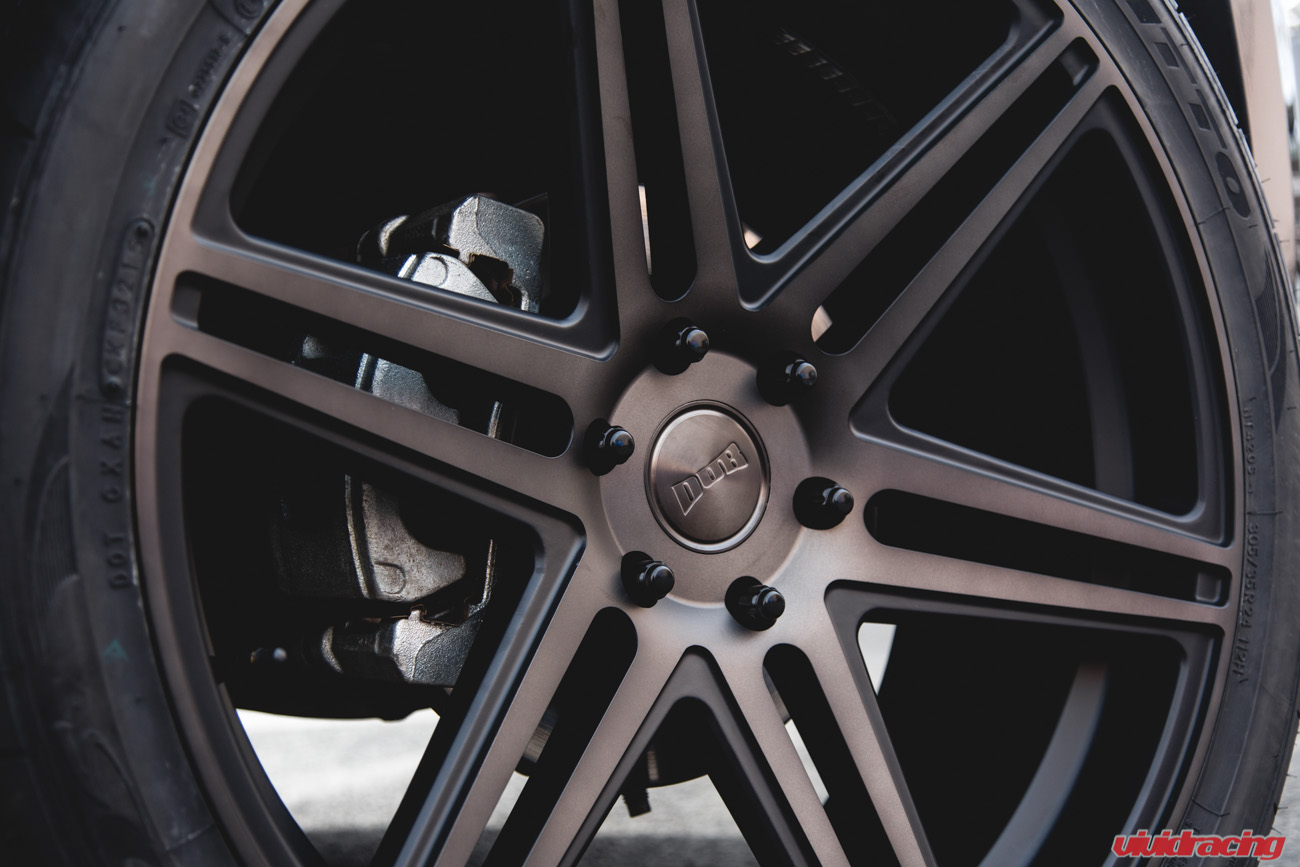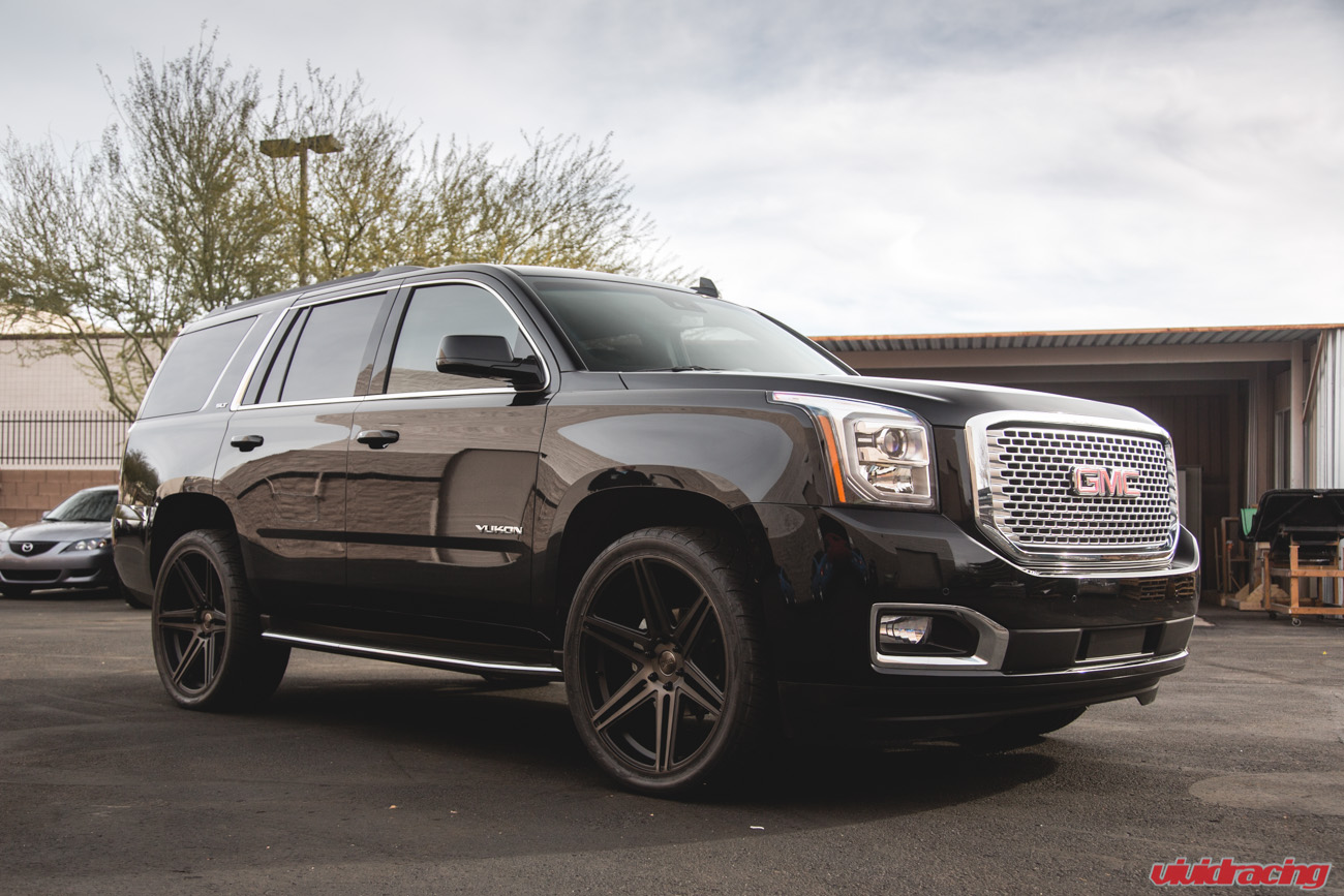 No matter the vehicle, we like to do it in style. This is not the first Tahoe/Yukon we have done here at Vivid Racing. We previously did a Denali XLT with these same wheels but lowered on McGaughys drop kit. This customer scooped up a brand new 2016 GMC Yukon and wanted those stockers gone. Wheels make the biggest difference in any vehicle modification and the SUV is the same. So we hooked it up with some DUB Skrills S123 24×10 6 Lug Wheels in a Matte Black with Machined Finish. The wheels are the perfect upgrade for the daily driver SUV without compromising ride quality. These wheels were wrapped in a set of Nitto NT420 Tires that were 305/35/24. Along with some new TPMS sensors, this package comes to your door at about $3800 shipped. DUB wheels are made by MHT Wheels who proudly own and make wheels like Niche, Rotiform, Fuel, and more. Shop all our Wheels Here and contact us to order this package!