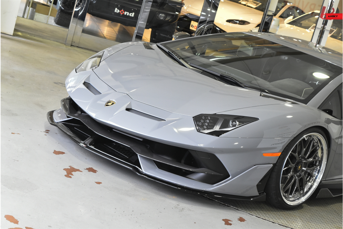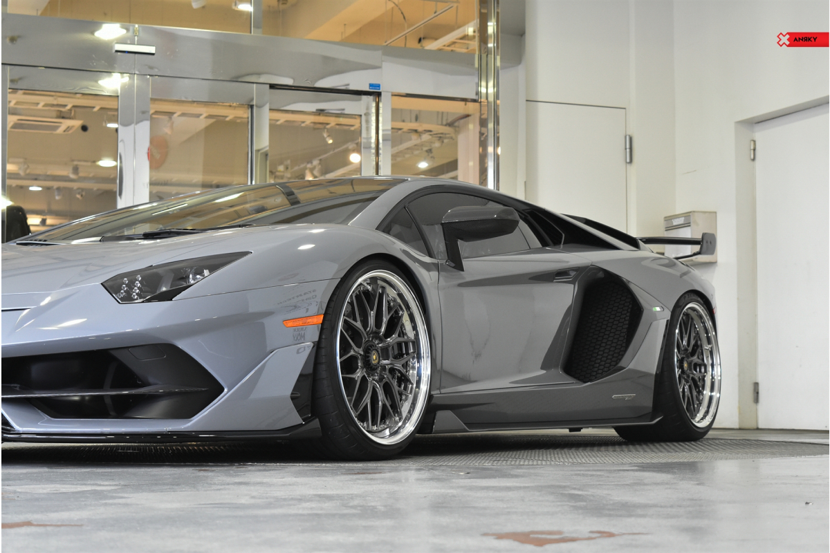 The 2020 Lamborghini Aventador SVJ pictured here is sitting on 20×9.5 / 21×13.5 ANRKY RETRO Series RS1 wheels wrapped in Pirelli tires. The Italian supercar is lowered on Novitec springs to give it an even more aggressive look when merely at a standstill. These wheels feature a mirror polished smoke center with a mirror-polished outer/inner and exposed ARP hardware with the center lock option. This finish combination pairs beautifully with the Aventador’s Grigio exterior color to give it that clean look that grabs your attention without being over the top. It really looks as though these wheels were made for this car and like they say: if the shoe fits…