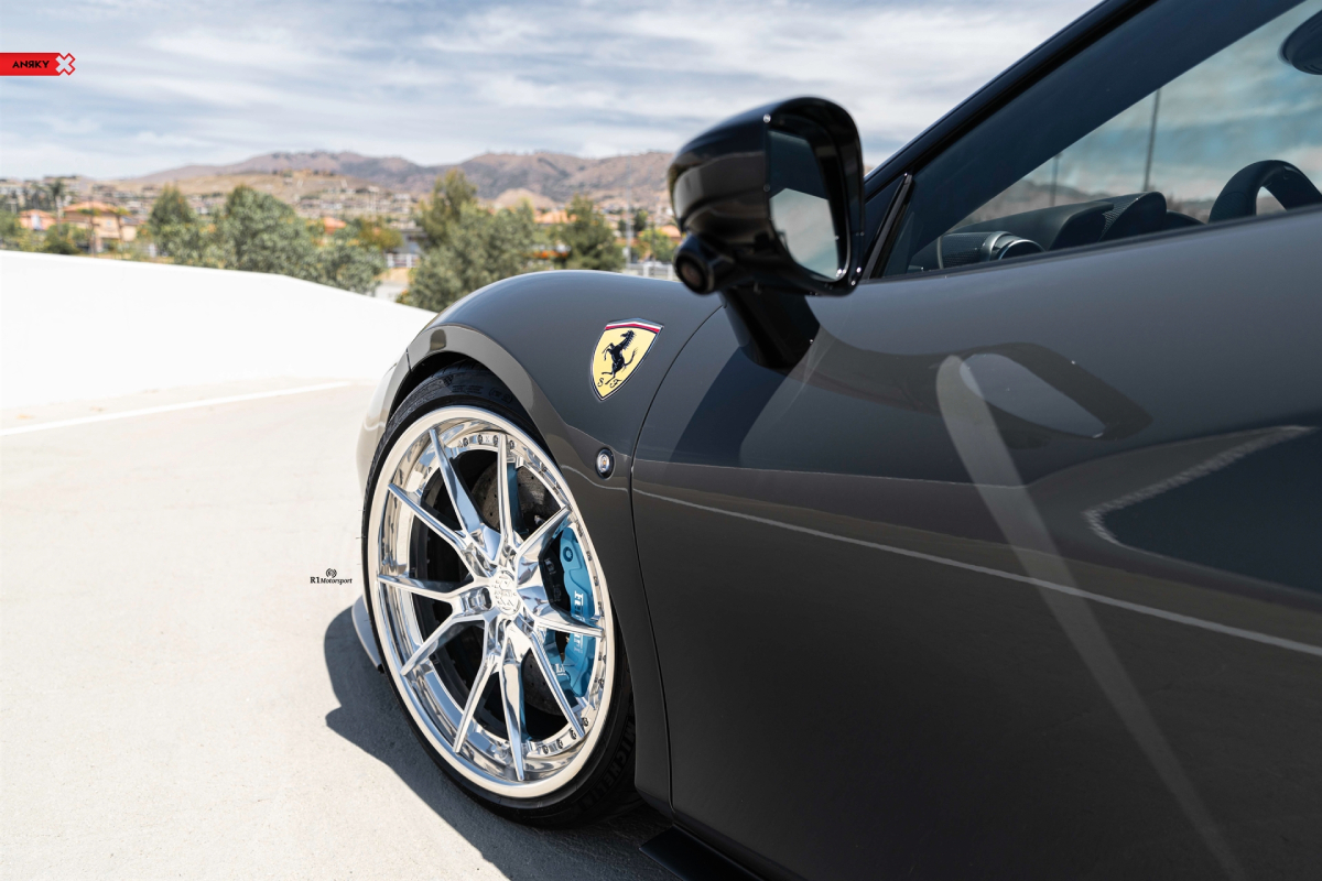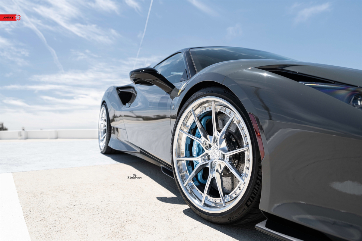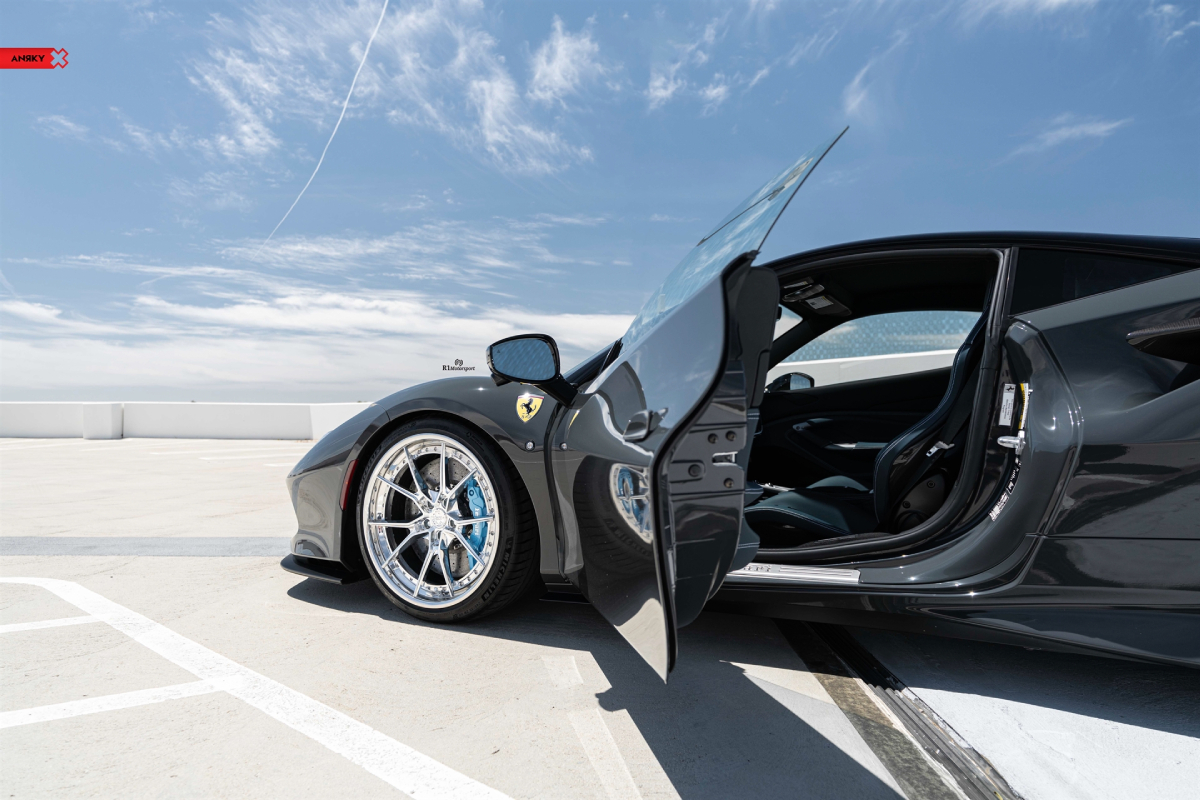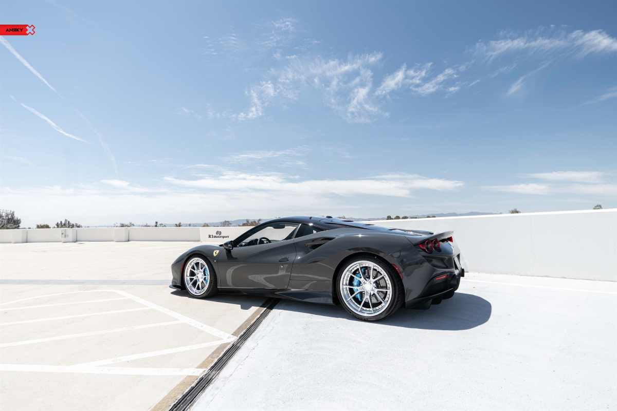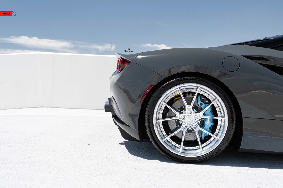The stunning Ferrari F8 Tributo spotlighted in this post looks incredible wearing ANRKY’s AN32 SeriesTHREE wheels. They are sized 20×9.5 at the front and 21×13.0 at the rear. While there is nothing necessarily wrong with the stock wheels, these three-piece forged wheels really elevate the sportiness and luxury of the F8 Tributo. The AN32 wheels on this mid-engine supercar feature a brushed clear face, mirror polished windows, mirror polished clear outer and inner, with exposed ARP hardware. The vehicle is also sporting a beautiful Nardo Inozetek wrap and sitting lowered on Novitec springs.