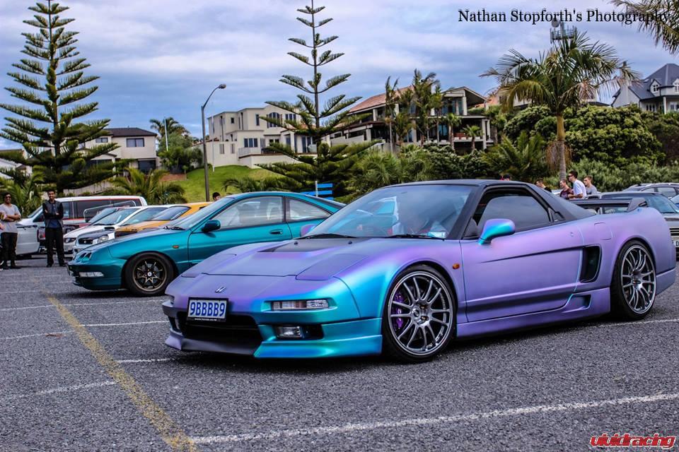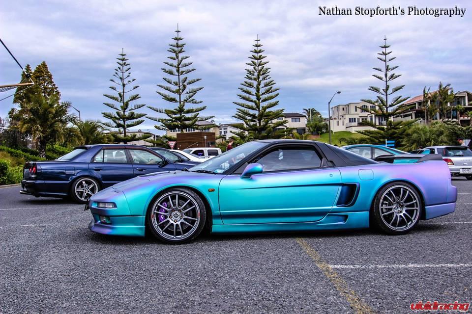 New Zealand called and wanted some new wheels for his crazy chameleon painted Acura NSX (called a Honda there). So we hooked him up nice and good. It is running on Enkei GTC-01 wheels with a massive 8 piston front big brake kit by D2. The car has been lowered on BC Racing Gold Coilovers and features many exterior accutrements. Seibon NSX-R hood, Wings West full kit, JDM Kite Side Scoops, and Seibon NSX-R rear carbon fiber wing. Vivid Racing ships worldwide and carries a wide variety of JDM parts including stuff to outfit your Acura NSX. Check out all Acura Honda NSX Parts here.