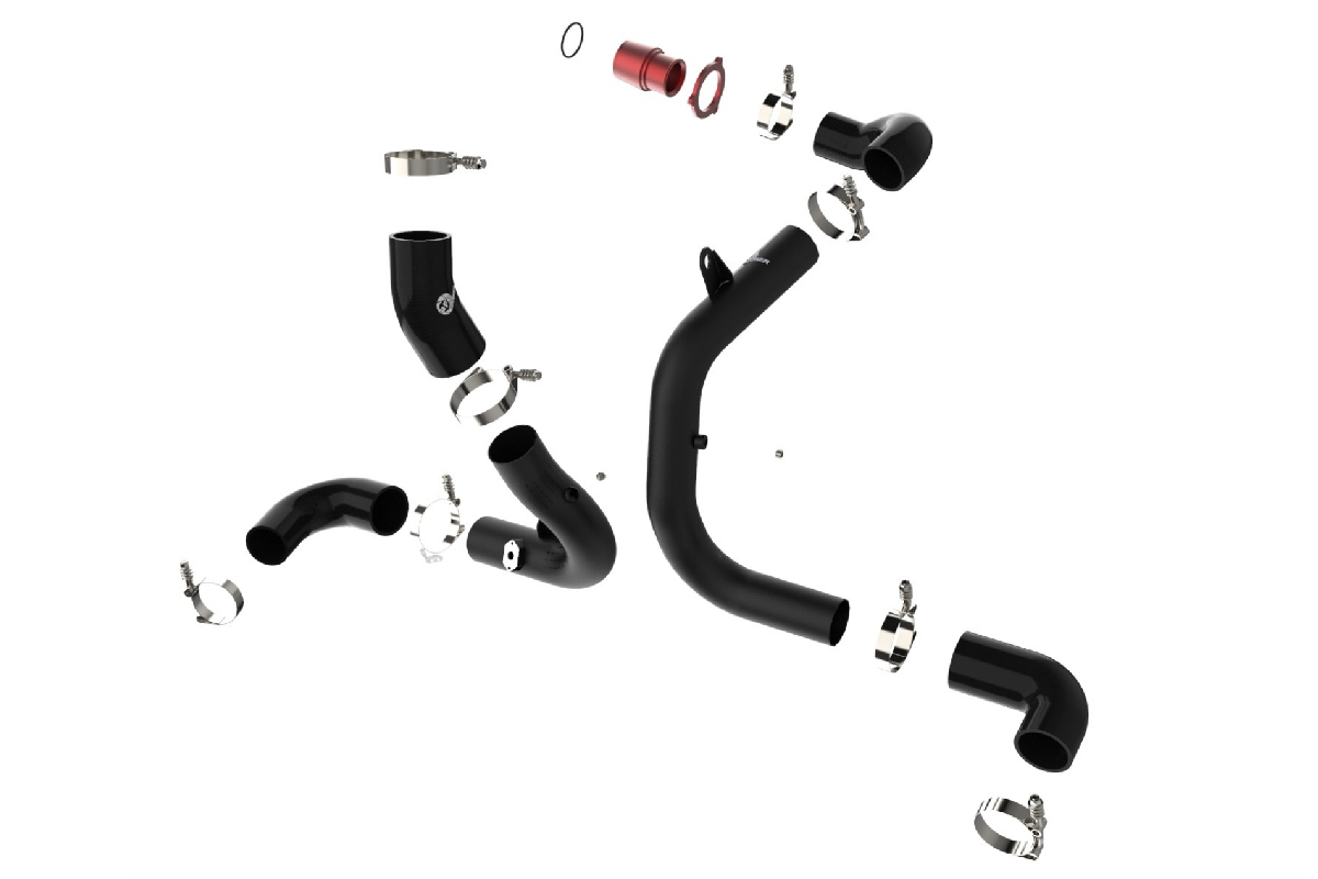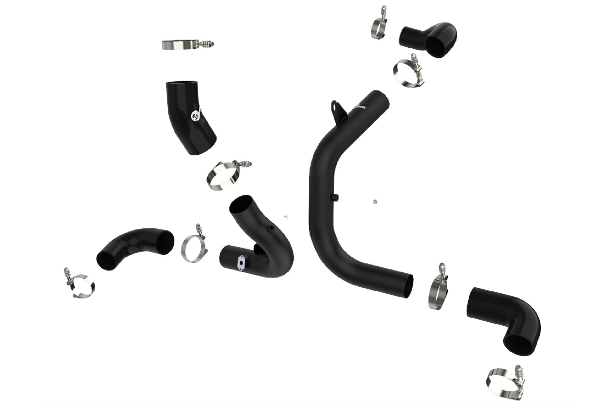 The aFe BladeRunner Hot and Cold Charge Pipe Kit includes high-quality, stainless-steel, spring-loaded T-bolt clamps and heavy-duty, 5-ply polyester reinforced silicone couplings for added strength and resilience. Both kits below are finished in an attractive wrinkle black powder coating with the aFe Power logo laser etched on the tube for a customized look.