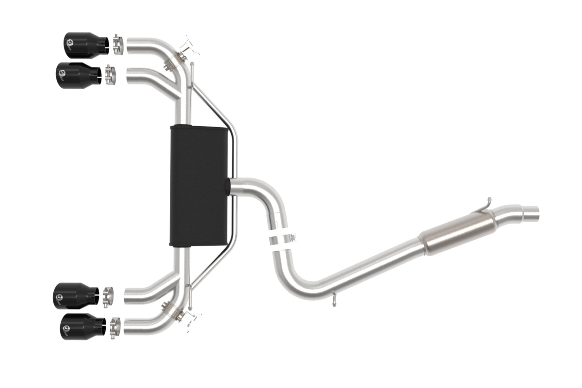 This exhaust system is constructed from 3-inch to 2-1/2-inch mandrel-bent brushed finished 304 stainless steel tubing for maximum strength and durability. This system features a stainless steel muffler that produces a uniquely aggressive sound that will be music to your ears. The muffler features a heavy-duty black finish for ultimate corrosion resistance. Dual muffler bypass tubes are incorporated into the system to optimize sound tuning. Finishing off this cat-back exhaust are quad 4-inch diameter 304 stainless steel clamp-on exhaust tips. The tips feature an aFe Power logo on them for added styling. Choose between black, carbon fiber, blue flame, or polished exhaust tips for further customization.