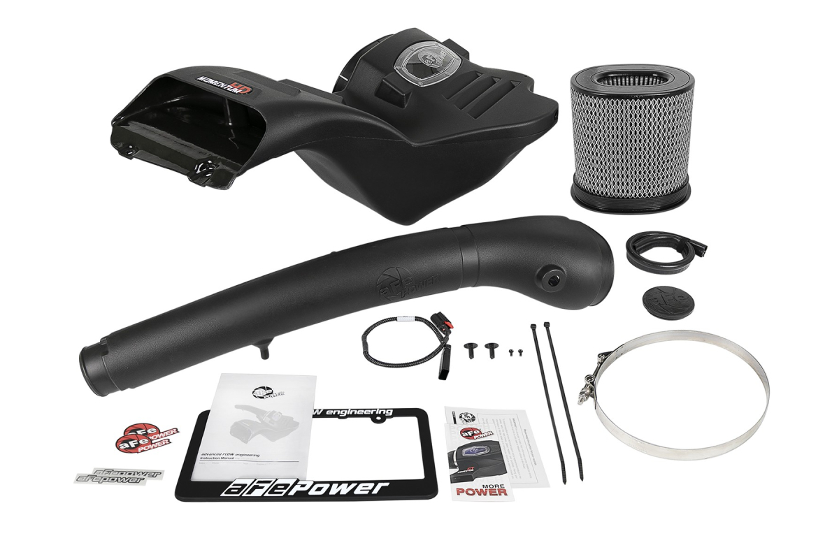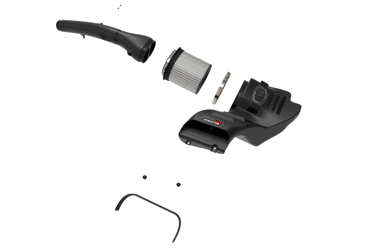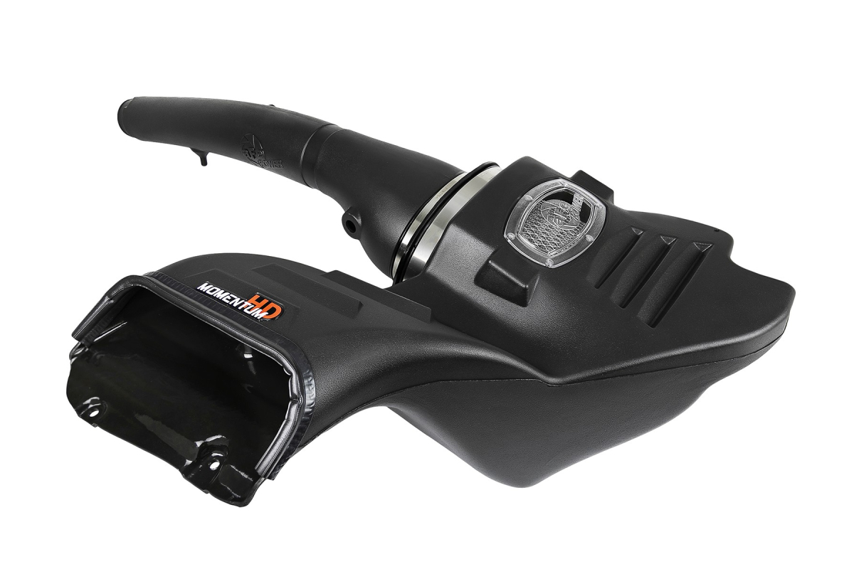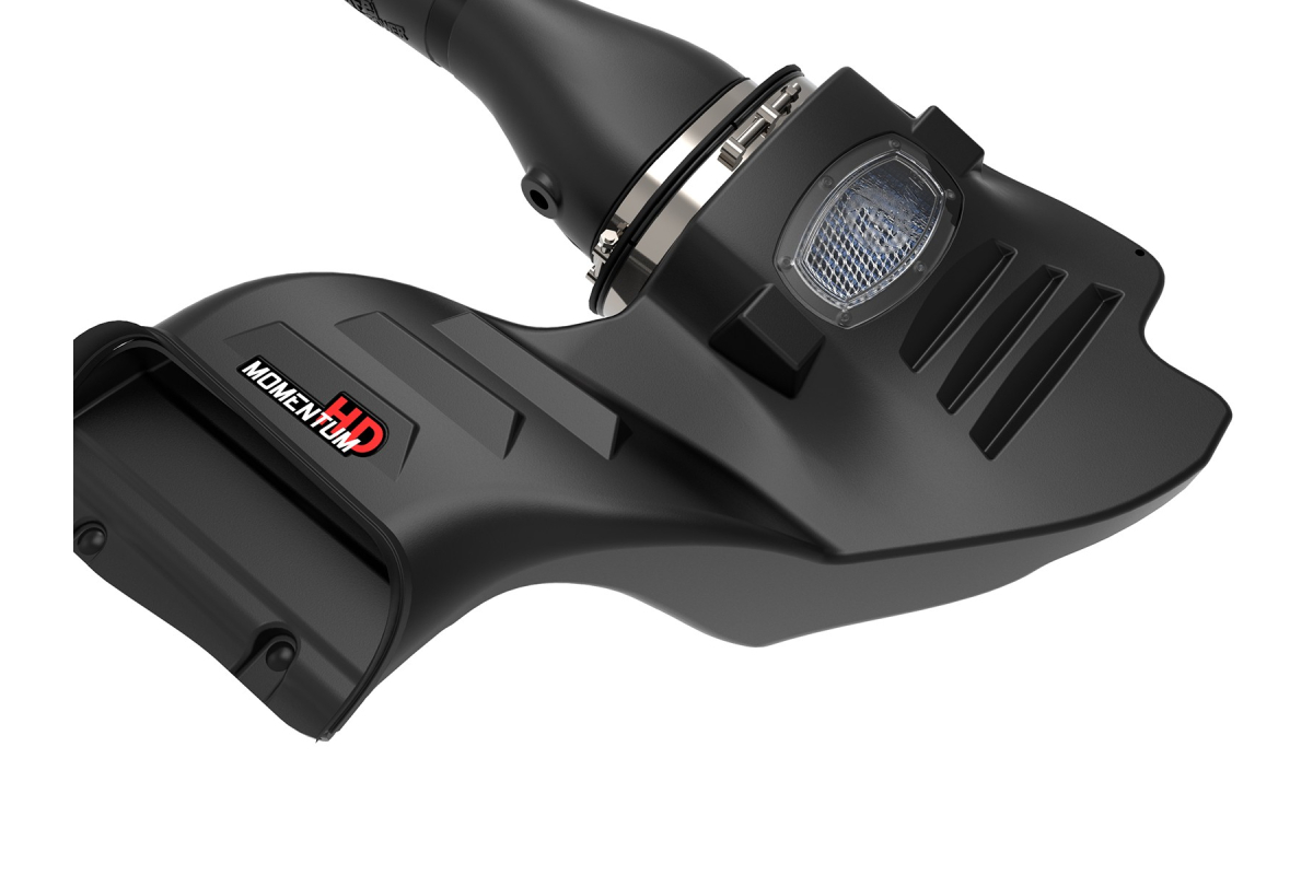 The Momentum HD Cold Air Intake System from aFe Power spotlights a unique, smooth one-piece housing. The patented filter-to-housing interface is made up of durable heat-resistant cross-linked polyethylene (XLPE). This innovative design minimizes the total number of parts, making for a seamless installation process. A large, clear sight window allows for hassle-free filter inspection for added convenience so you don’t have to disassemble the entire system. The housing also integrates factory air scoop inlets, using no additional hardware. An auxiliary air inlet is available to bring in additional air from the engine compartment in cold climates or can be closed with an included plug if desired.
