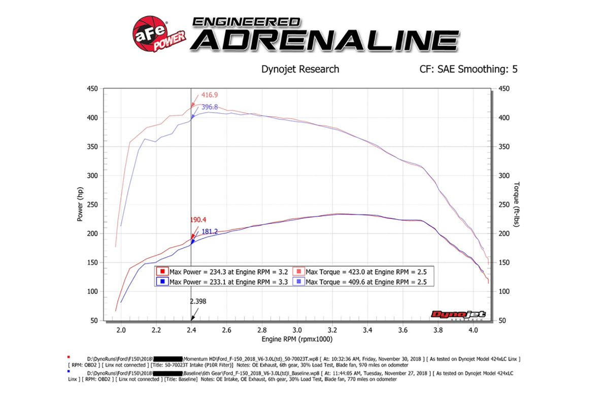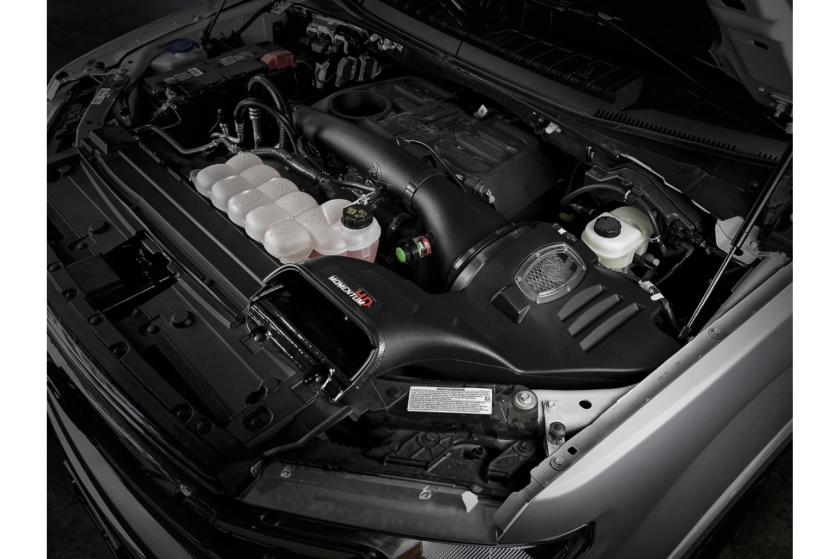 The aFe Momentum HD Cold Air Intake system features a high-quality, computer-designed, dyno-tuned intake tube used to achieve the maximum power gains possible, all while maintaining a perfect fitment. This is a direct-fit intake system that utilizes all the factory Ford F-150 mounting points; there is no cutting or modifications required. All necessary T-bolt clamps, couplings, and hardware are included as well. Once the system is installed, the air filter can be easily removed from the housing for maintenance by simply uninstalling just the intake tube. Check out the install video down below for more information.