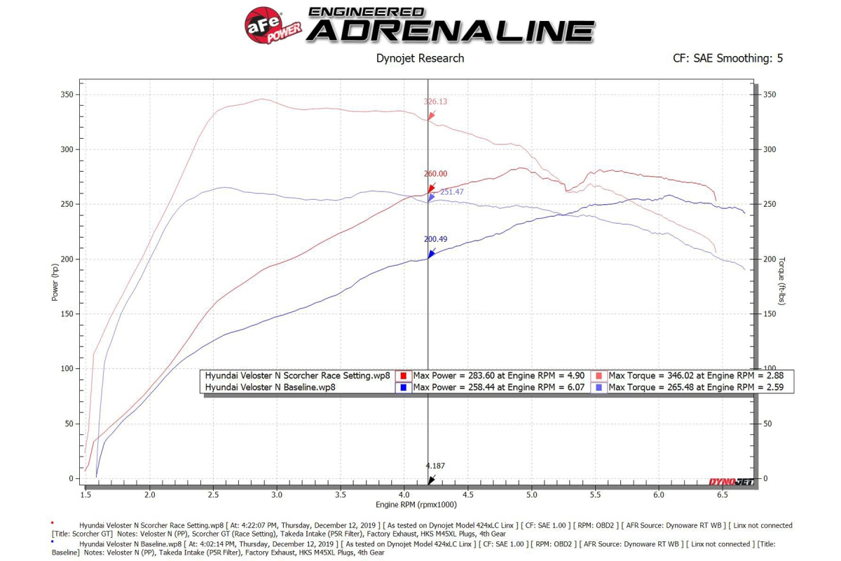 Why get the aFe Power SCORCHER BLUE Bluetooth Power Module? Well, it’s a great way to increase turbo boost and overall vehicle performance, while also getting double-digit power gains as proven on the brand’s in-house dyno. Made to accommodate your personal skills and driving needs, this power module has four settings loaded and identifiable via the LED light on the switch or in the app. Stock is green, sport is yellow, sport+ is orange, and race is red. The& Veloster N feeds its front wheels 275 horsepower and 260 pound-feet of torque via its turbocharged 2.0-liter four-cylinder. With aFe Power, you can achieve power increases of +60 horsepower and +75 pound-feet of torque when using race mode at 4,000 RPMs.