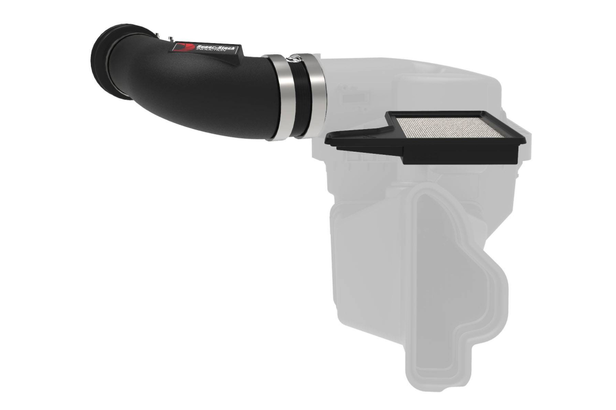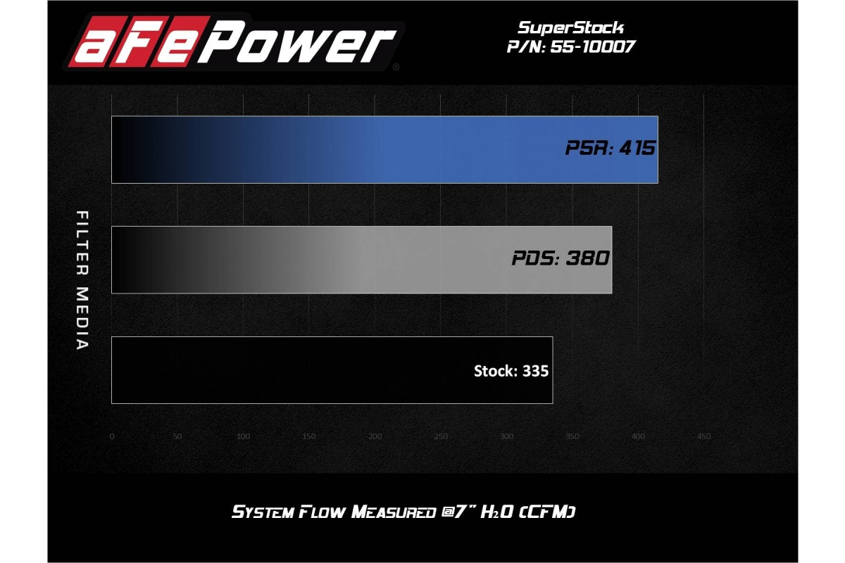 The aFe Super Stock Induction System comes with your choice of either the Pro 5R Filter or the Pro DRY S Filter. The former is made with five layers of pre-oiled cotton gauze designed to offer maximum performance. The progressive layering allows this filter to flow at high levels even with captured dirt particles. The Pro 5R media is best suited for street and/or track applications. Furthermore, it can easily be recharged with aFe’s Power Cleaner and blue air filter oil (sold separately). The Pro 5R filter outflows the stock Ford Mustang filter by 24 percent. With it, you can expect to gain 7 horsepower and 6 pound-feet of torque.