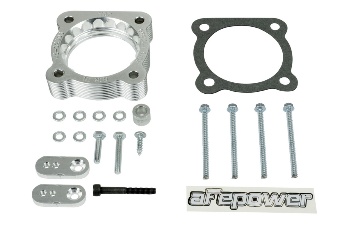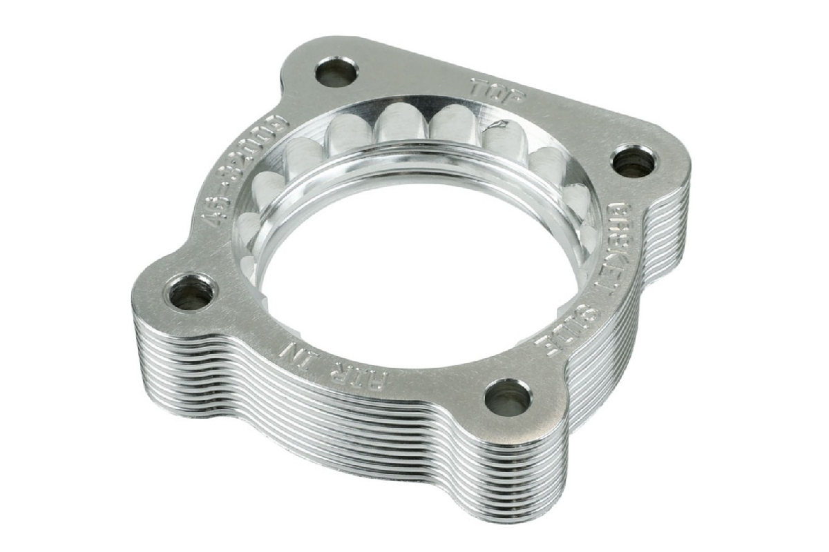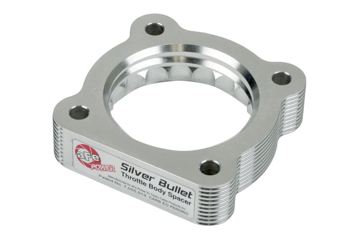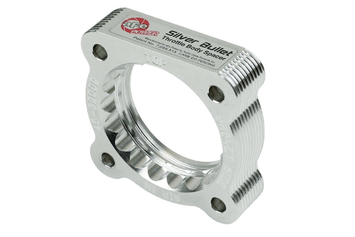 The Silver Bullet Throttle Body Spacer from aFe Power features a combo serrated/helix design that generates air turbulence in the intake manifold. This turbulence increases the air pressure in the combustion chamber, resulting in increased performance and improved throttle response. This strategic combination design also reduces the intake whistle that often occurs with helix-only designs (US PAT 07055513).