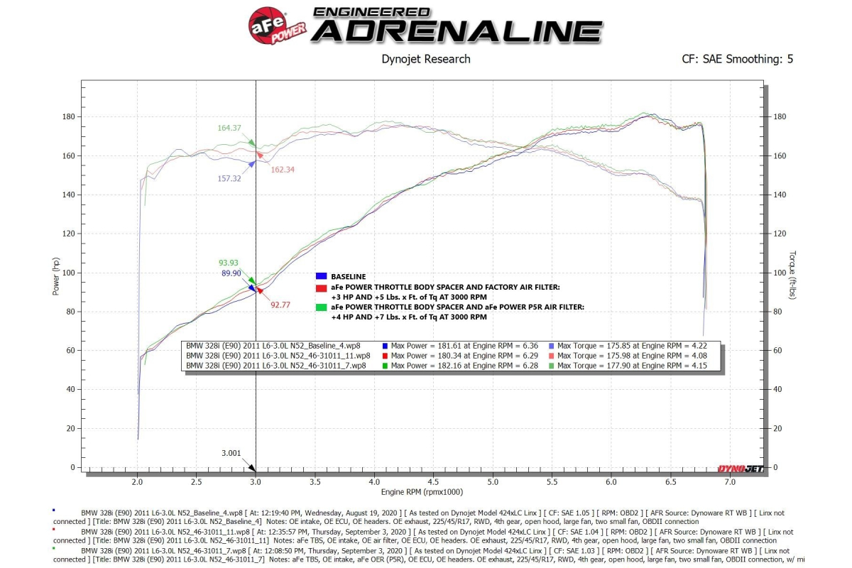 - Dyno-Proven Gains up to +4 HP & +7 Lbs. x Ft. TQ w/ Throttle Body Spacer and aFe POWER P5R Air Filter (30-10131)