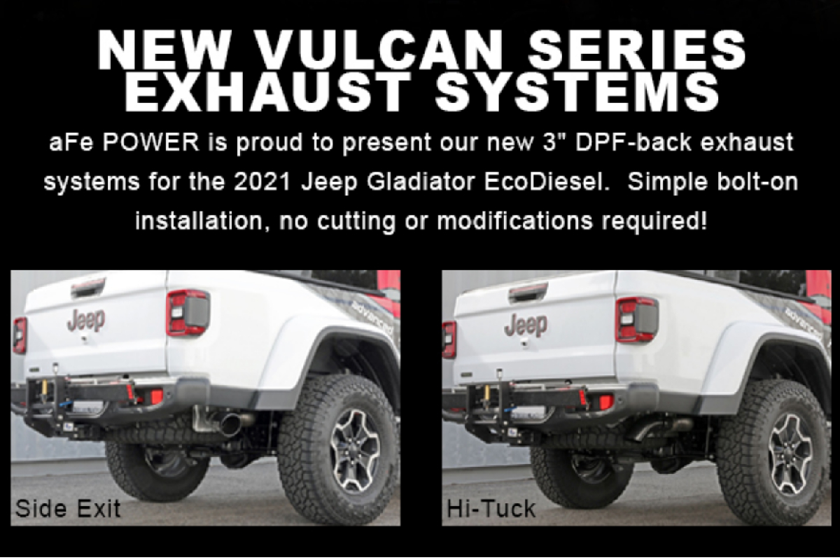 aFe Power, the expert in air intakes and exhaust systems, has just released three new Vulcan Series 3 stainless steel exhaust systems for the Jeep Gladiator EcoDiesel model. The first is a DPF-back system with black tips, the second is a DPF-back system with polished tips, and the third is a DPF-back Hi-Tuck system with black tips. The DPF-back exhaust systems from aFe are constructed from 3-inch mandrel-bent 304 stainless steel tubing for optimal durability. All of these exhausts utilize state-of-the-art computer-aided design technology to deliver a custom, high-tolerance factory fitment. They have also all been MIG-welded for race-proven strength for reliability you can count on.