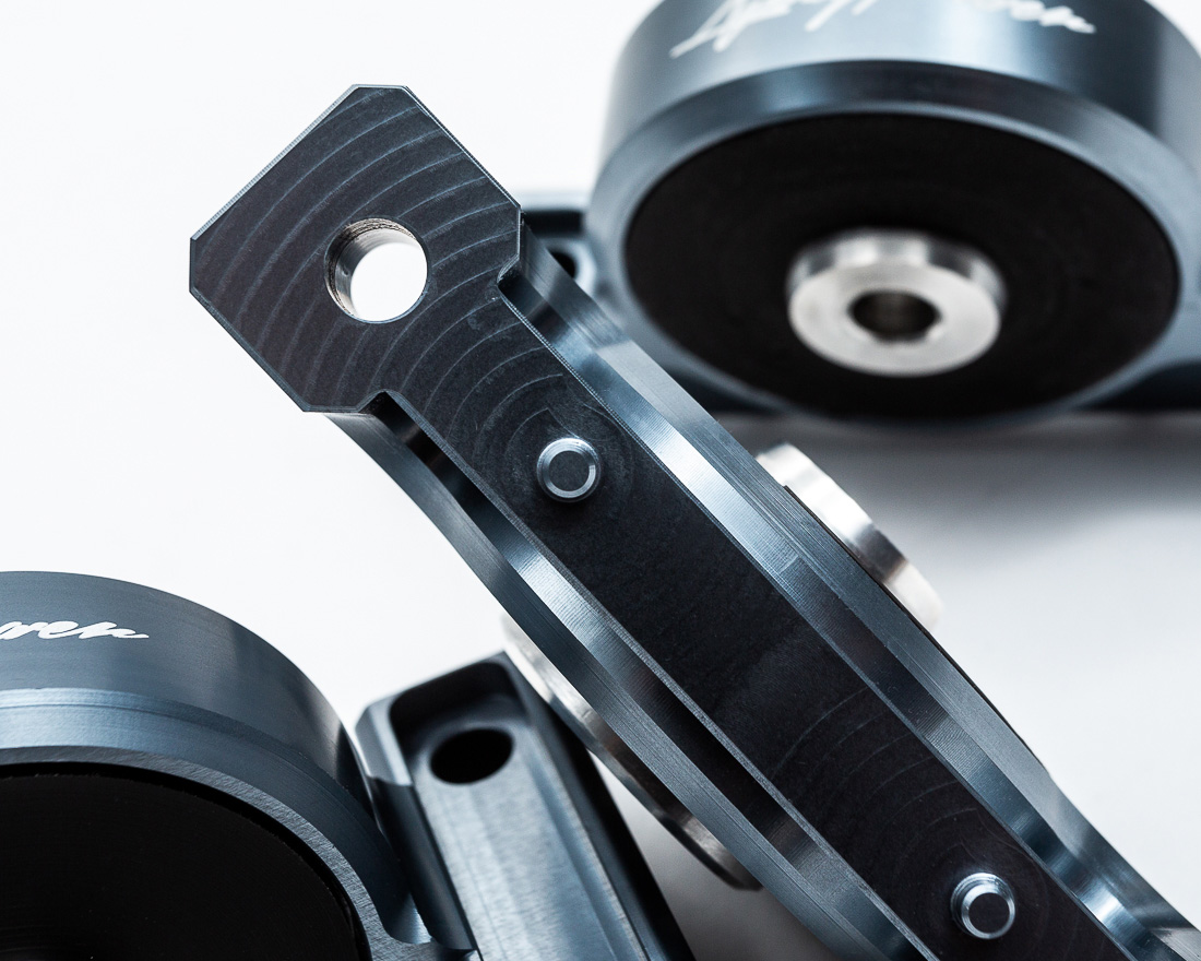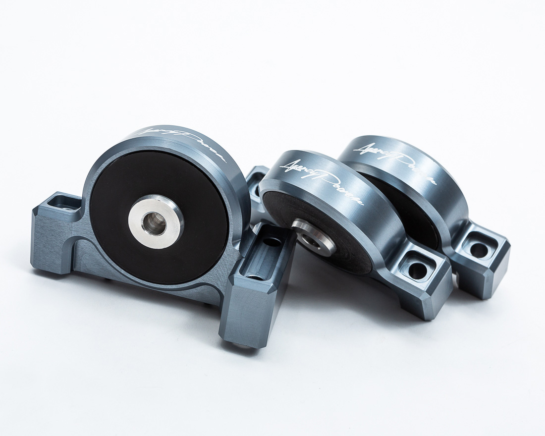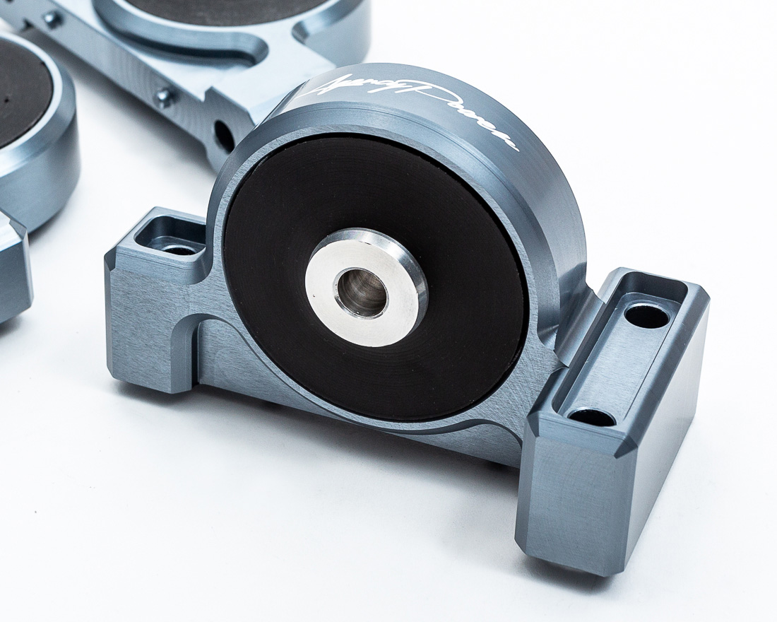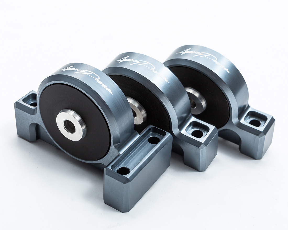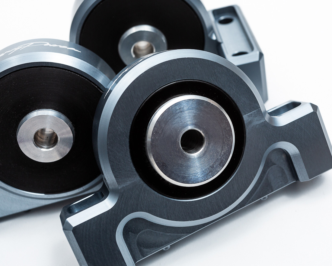 These new mounts are available as a transmission mount and motor mount set, or just a transmission mount by itself. Unlike the weak cast construction of the OEM mounts, these mounts are made from 6061 CNC machined billet aluminum, making these much stronger. Each mount uses a polyurethane bushing with a Shore Durometer of 88 to provide a perfect balance for weekend fun and competition needs. By using a poly bushing, deflection is decreased which means your engine will move around less, especially if you’ve increased the power. The mounts are designed to be an OEM replacement and include everything you need for an easy install.