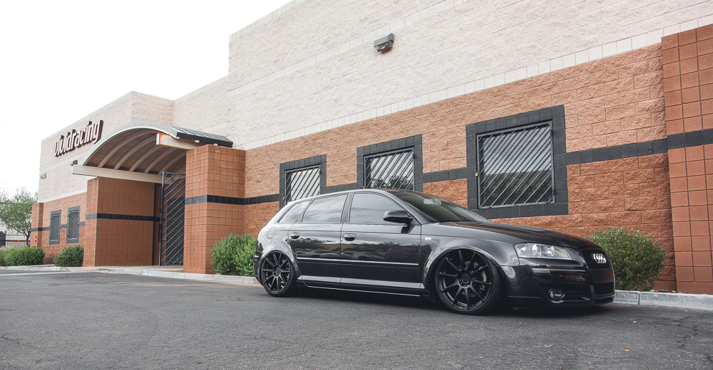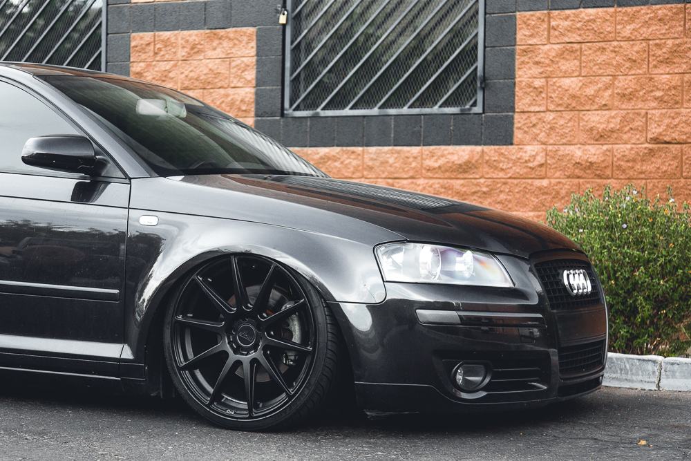 Audi A3 bagged using AirLift Slam Series Air Suspension sitting on 19×8.5 5×112 +42 Matte Black Niche Essen M147’s