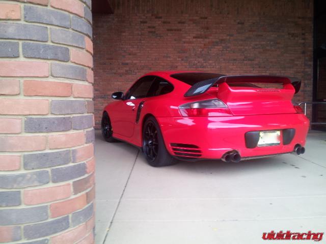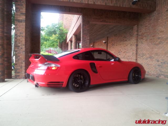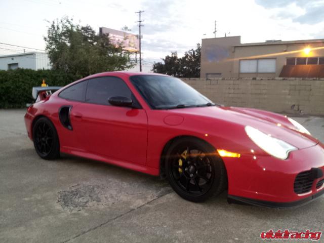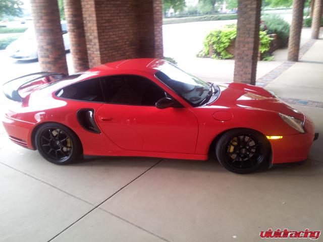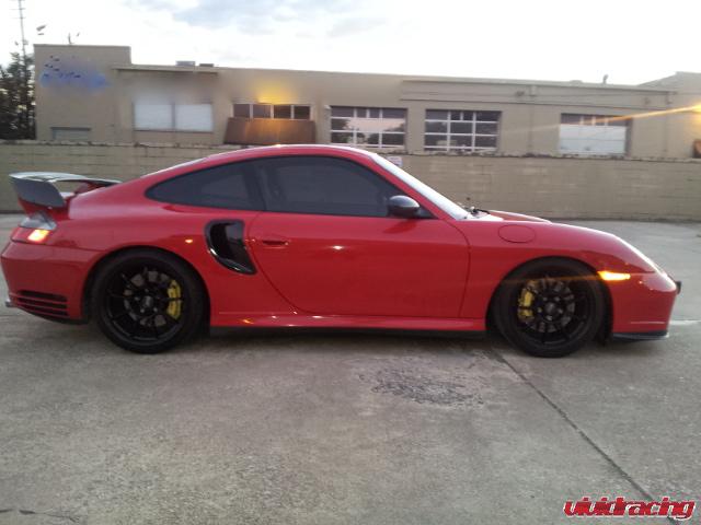 This Porsche 996 Turbo is built to the max with Vivid Racing parts to own the streets of Alabama. The red Porsche 996 Turbo features our K16/16G turbo package with all the bolt ons. The turbo upgrade takes the stock K16 turbochargers and adds 16G mitsubishi exhaust wheels to them and 1 bar wastegates. As we have proved many times over, this setup knocks out a mid 10 second 1/4 mile and rockets a standing mile in about 196mph. In addition to the turbo upgrade is a custom OBDII ECU Flash by VRTuned. Bolt on Agency Power intercoolers, high flow y-pipe, throttle body/plenum kit, exhaust system, headers, 60lb injectors, and more. In addition to the power parts, this 911 got some sweet interior enhancements from that of Recaro Pole Position seats and a OMP racing steering wheel. He finished the car off with a nice GT2 style carbon fiber wing, carbon fiber side ducts, and a set of black wheels that make his yellow brakes pop. Like this setup, check out all these Porsche 996 Turbo power parts here.