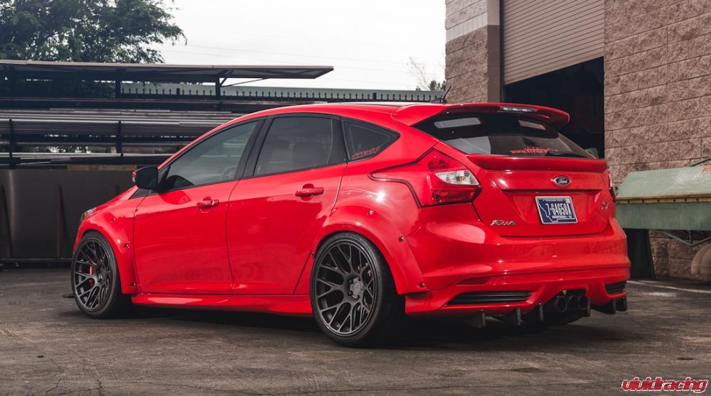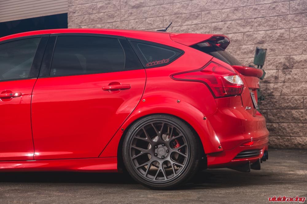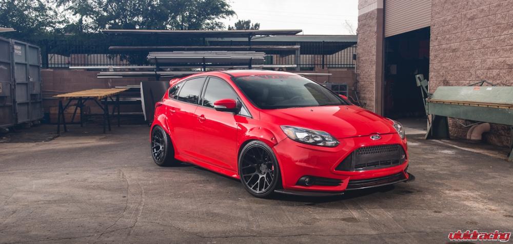 Our super awesome Ford Focus ST is just over a year old with 3000 miles on the clock.  Still looking fresh with the Agency Power fender flares, grill, hatch wing, and diffuser, we decided to do some new photos in the back lot.  What makes this turbo EcoBoost so different is the bolt on mods, widebody wheels, and aggressive stance.  Having this car as a daily driver is suprisingly comfortable.  The KW Variant 3 coilovers give a smooth ride and really handle well along with our beefy prototype rear sway bar kit.  Using Falken tires on our 19×10 Niche 3piece wheels, we have no issues stopping with the upgraded Brembo 4piston 365mm 2 piece rotor brake kit on the front.  Along with the Cobb Tuning AccessPort, the Focus is a little tiny power machine.  Now if only we could have it all wheel drive!  Photos by Cody Gephart.