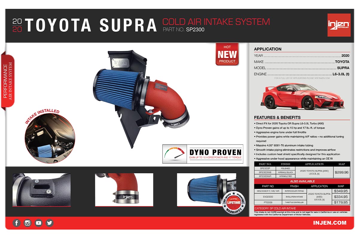 Injen developed a cold air intake for the A90 Supra to provide optimal airflow to the engine. The factory B58 intake seems too restrictive which can rob the engine of potential power. Installing the all-new Injen cold air intake will improve performance, provide a distinct induction growl, and also gives the Supra a little extra kick.