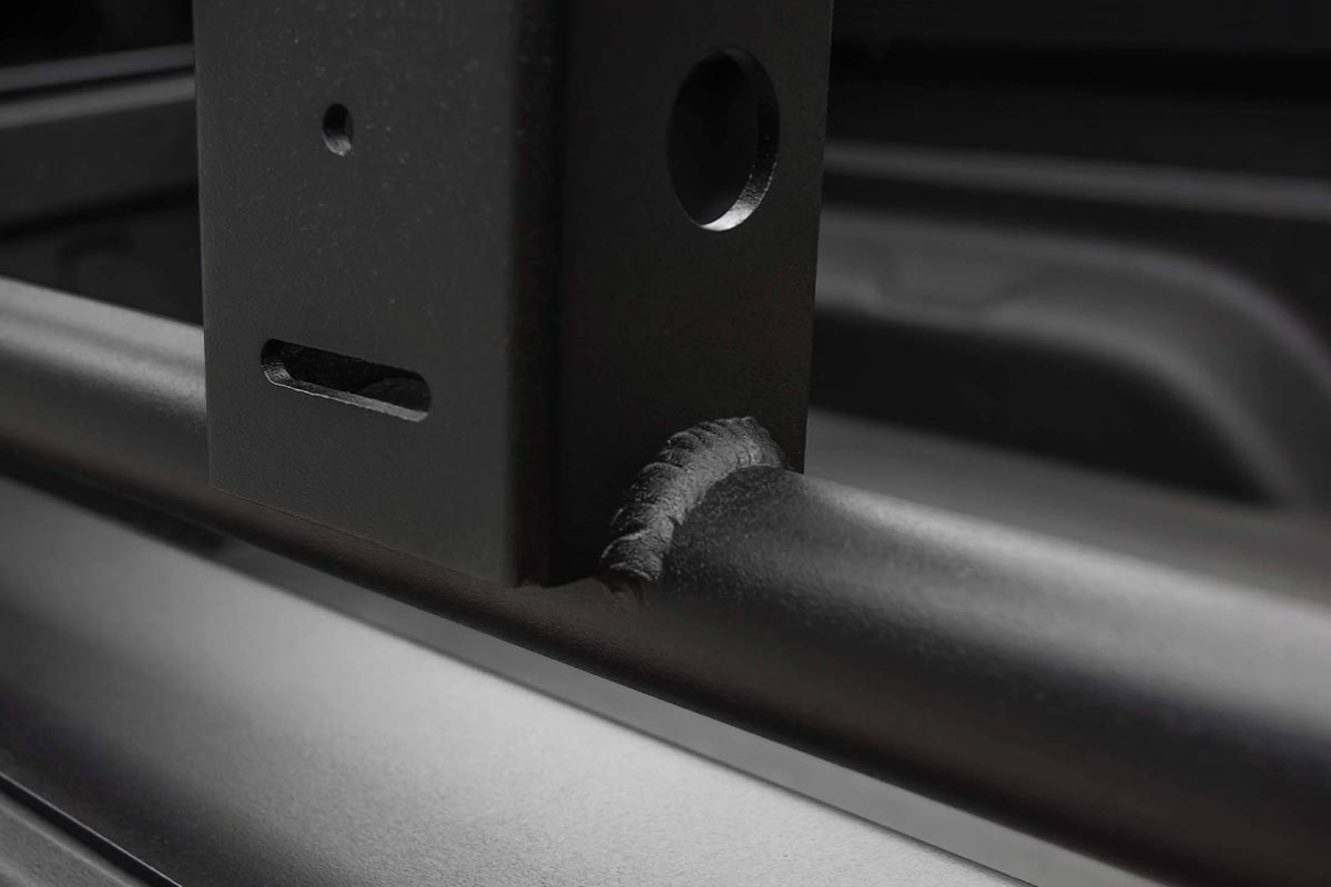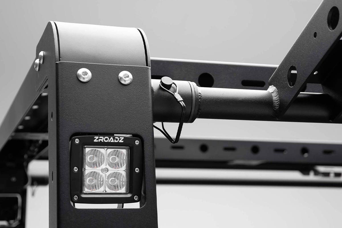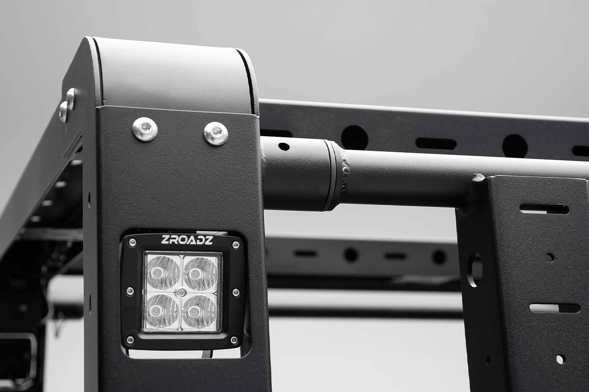 For ultimate utility, ZROADZ offers four 3-inch pod lights to illuminate your surroundings when accessing the bed. With optional mounting accessory provisions throughout the overland rack, mounting brackets can be added for additional storage. To top of the rugged design, the overland rack features a strong and durable three-stage black powder coat finish.