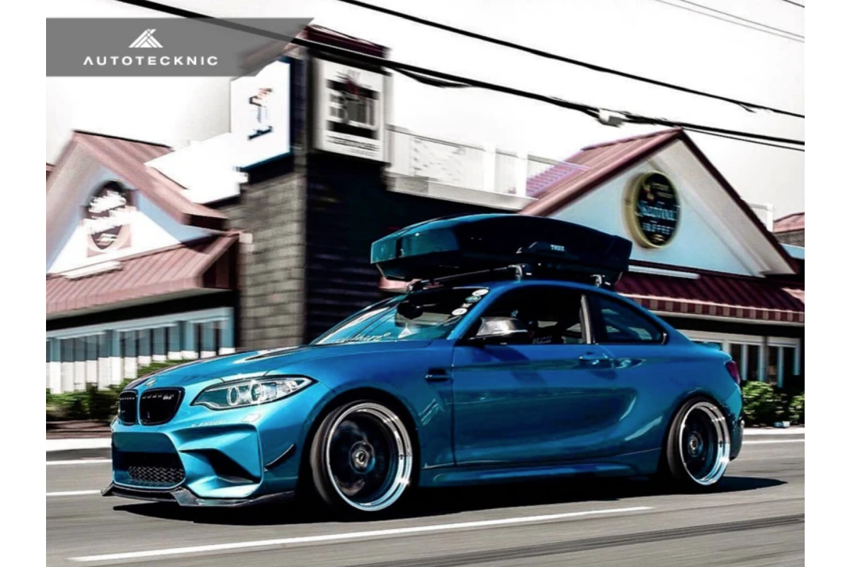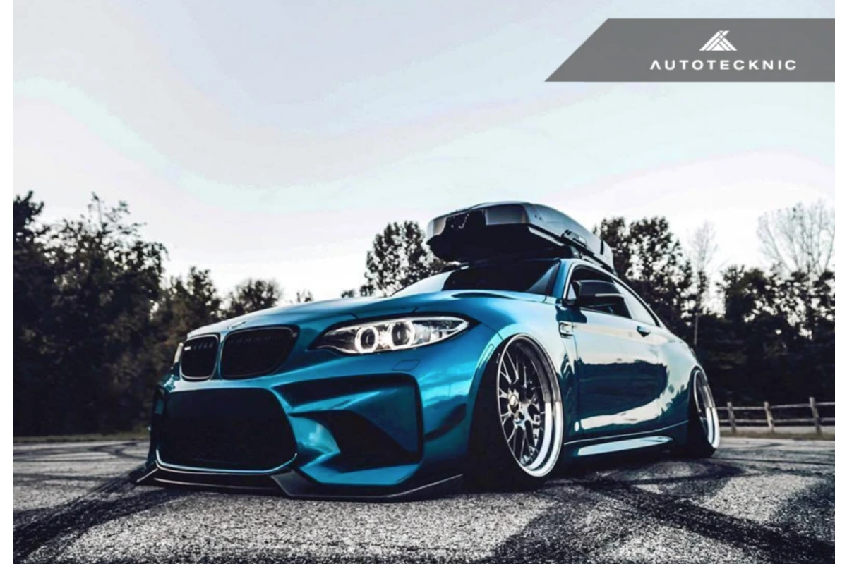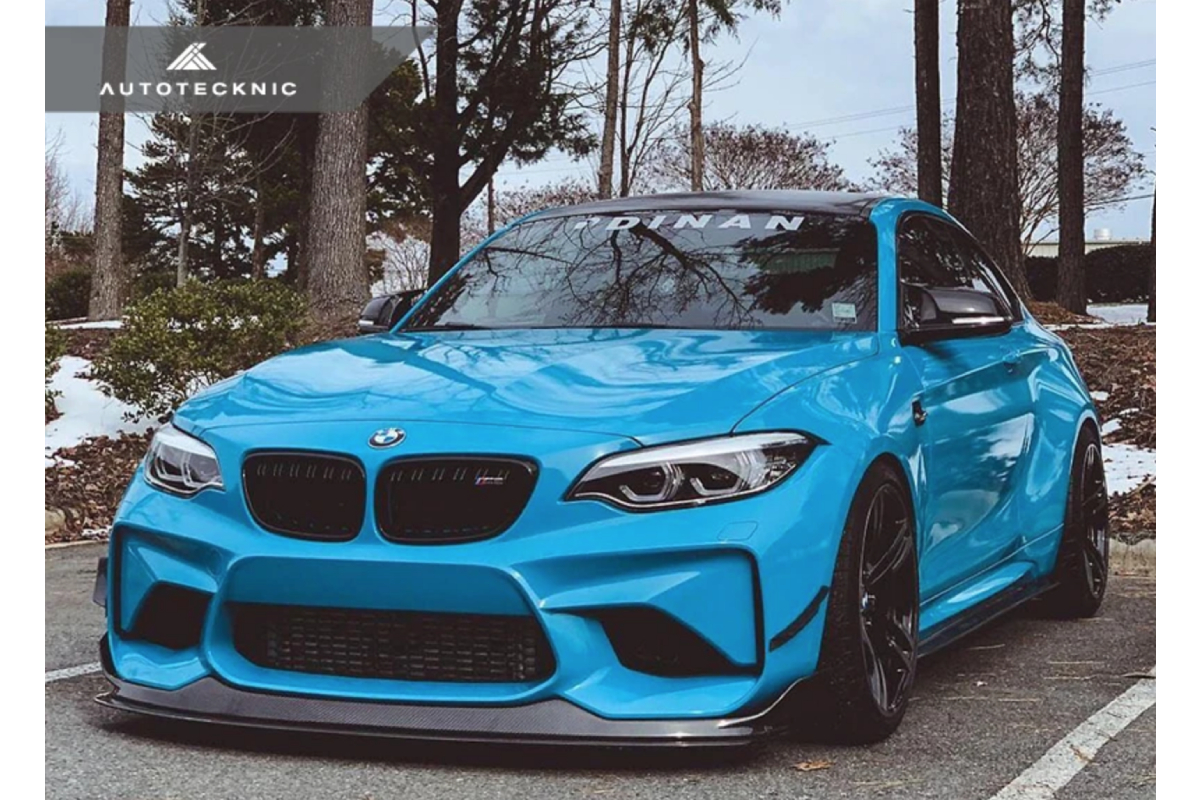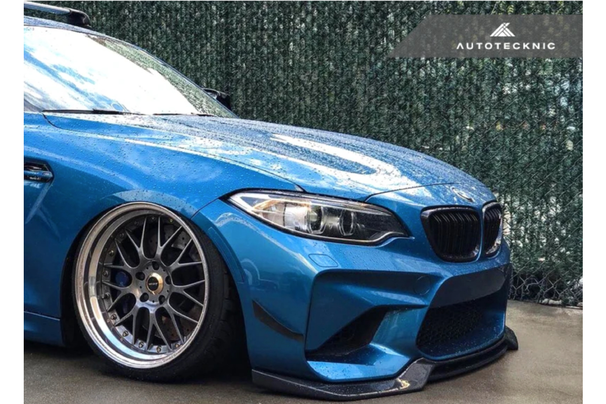 The new AutoTecknic Carbon Fiber Front Bumper Canards for the BMW F87 M2 are a complete solution to aerodynamically tune your car’s front end handling while boasting an aggressive aesthetic. Crafted from lightweight and durable carbon graphite composites, AutoTecknic’s Carbon Fiber Canards increase front downforce at high speeds, thus stabilizing the M2’s chassis during hard cornering. At the same time, these functional canards improve the car’s traction for quicker lap times. If you are looking to add a bit of pizzazz to your F87 M2, then these front bumper canards are the perfect mod that’s simple, practical, and stylish.