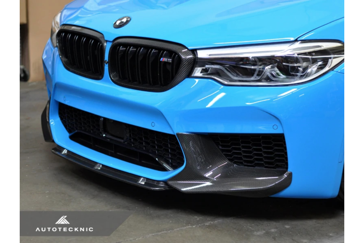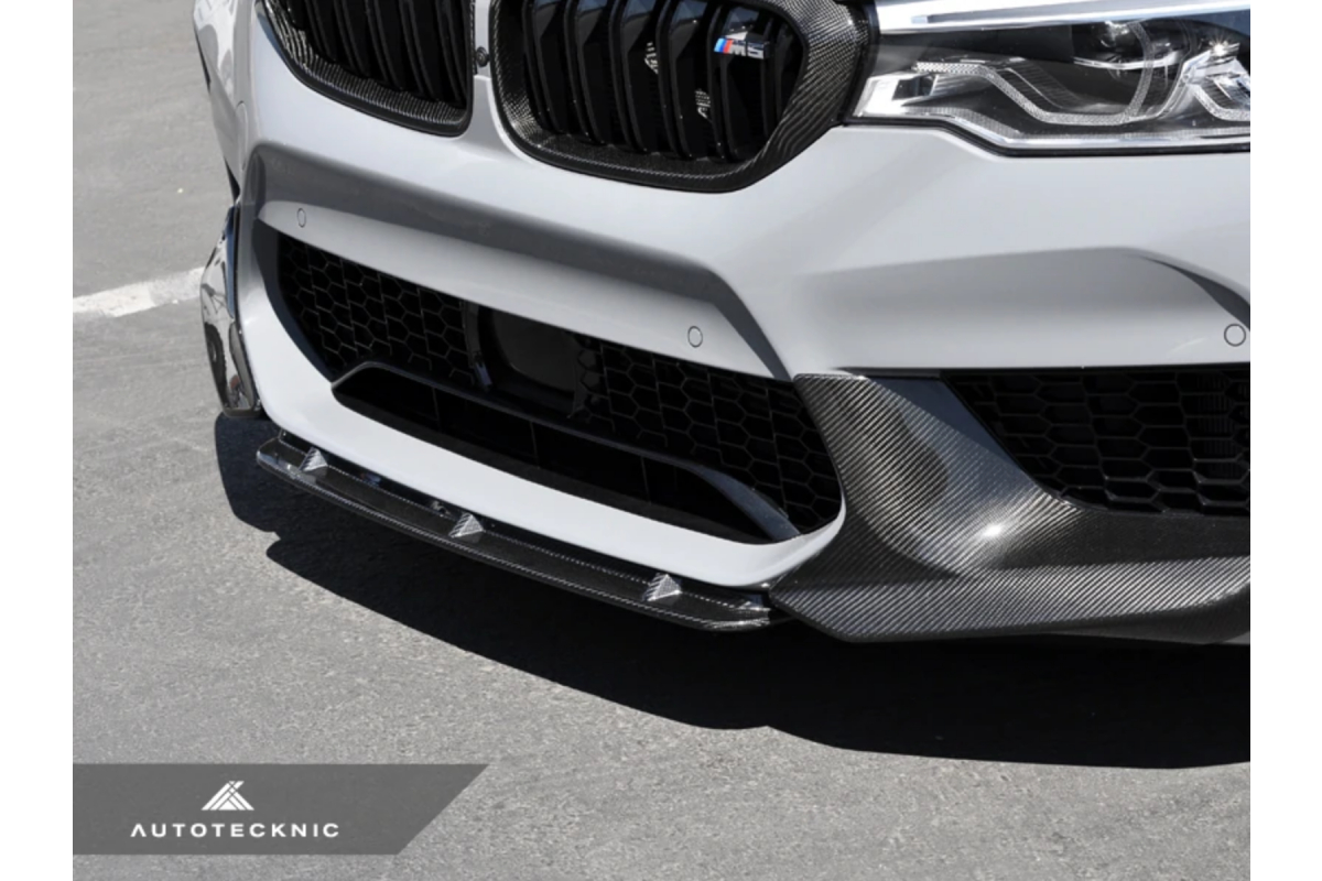 AutoTecknic’s latest release for the 2018-2022 BMW F90 M5 is its Dry Carbon Fiber Center Front Lip Spoiler. Both highly visible and highly functional, this lip is a lightweight and ultra-durable piece that will add great looks and enhanced aerodynamics to your M5. Made from dry carbon, rather than wet carbon, this front lip is the highest quality version you can get. Dry carbon fiber is formed using an impregnated piece of carbon that is first put into a mold and then in a sealed vacuum to cure at the appropriate rate. This process results in the least amount of waste and forms a lighter material than using the “wet method”. In addition, the autoclave manufacturing process for dry carbon delivers fewer pinholes and nearly no air pockets whatsoever.